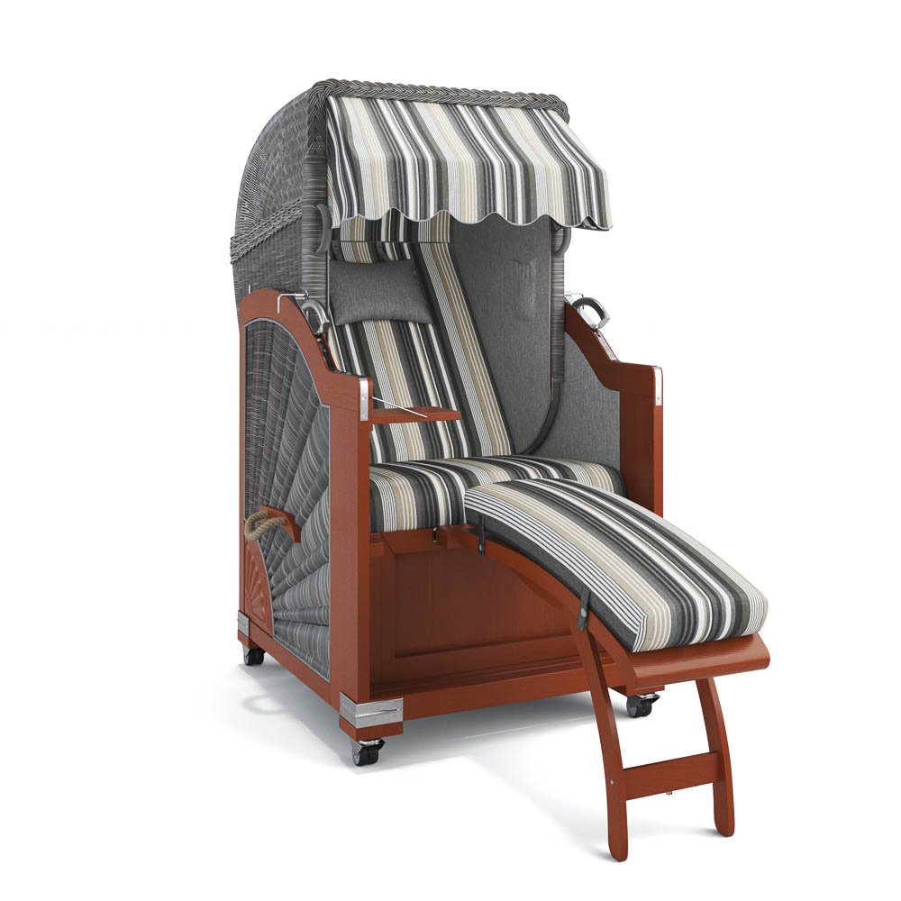 Der Einsitzer-Strandkorb „List“ überzeugt mit einem praktischen Staufach unter der Sitzfläche. Hier lassen sich die einhängbare Fußstütze und die Abdeckhaube bequem verstauen, sodass sie immer ordentlich verstaut und griffbereit sind. Eine durchdachte Lösung für mehr Komfort und Ordnung.