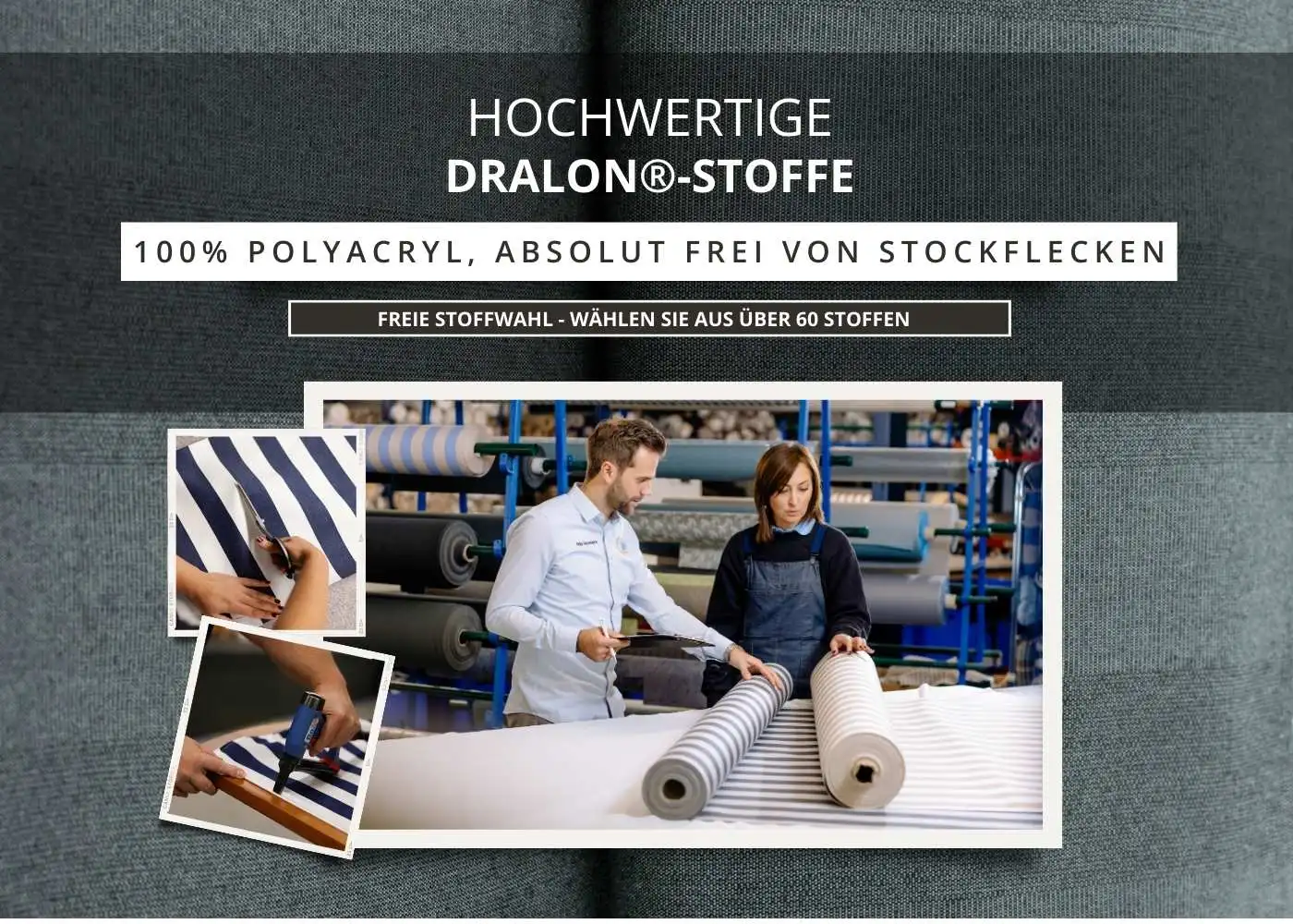 Alle unsere Stoffe sind aus hochwertigen Dralon® und somit pflegeleicht, schimmelresistent und leicht zu reinigen.