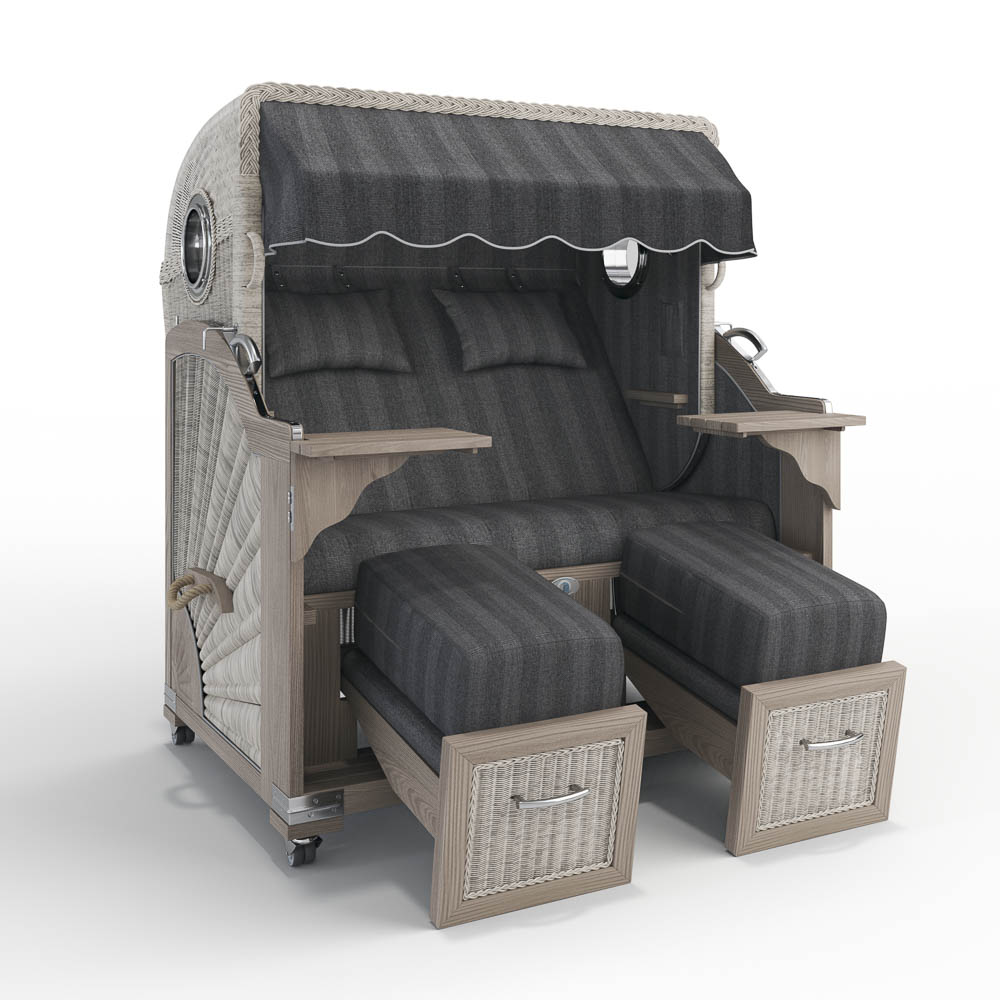 Machen Sie es sich gemütlich! Dieser luxuriöse Volllieger-Strandkorb mit herausziehbaren Fußablagen und bequemen Nackenkissen ist der bewährte Partner für angenehme Stunden im Garten und auf der Terrasse. Profitieren Sie vom großzügigen Platzangebot und einer Vielzahl von Annehmlichkeiten. Für eine eindrucksvolle Optik sorgen die weiche, geschwungene Form, das handgebürstete Edelholz und das exquisite Sonnengeflecht an den Seiten. Mit dem cleveren Komfort-Duo-Lifter richten Sie den Oberkorb mühelos so aus, wie Sie es mögen. Und für den perfekten Rundum-Blick in die Natur sorgen die maritimen Bullaugen. Auch als „Homeoffice“ ist das Modell Munkmarsch ideal: zwei große schwenkbare Notebook-Tische sind an den Seiten montiert. Ein Premium-Strandkorb zum Verlieben!